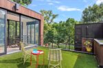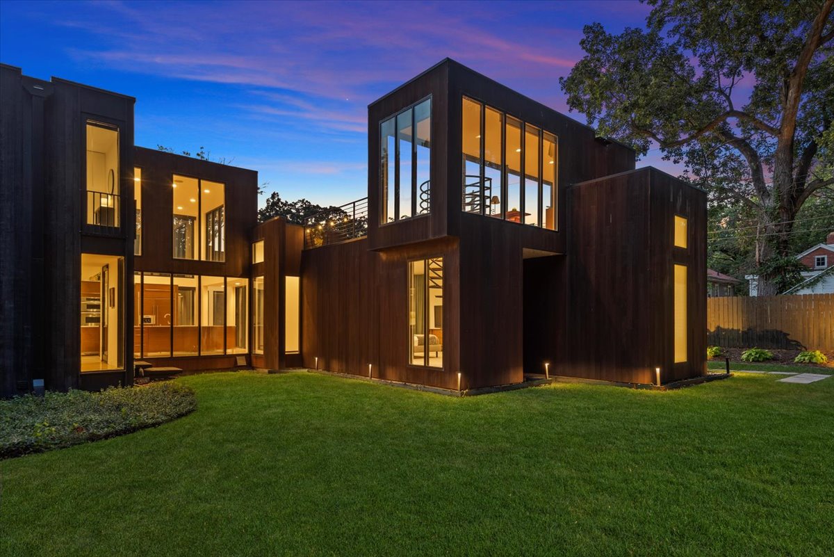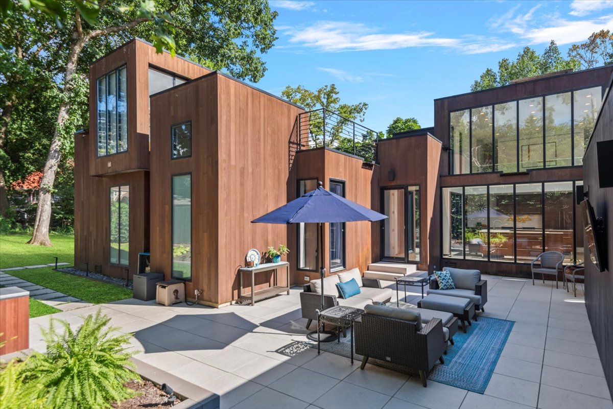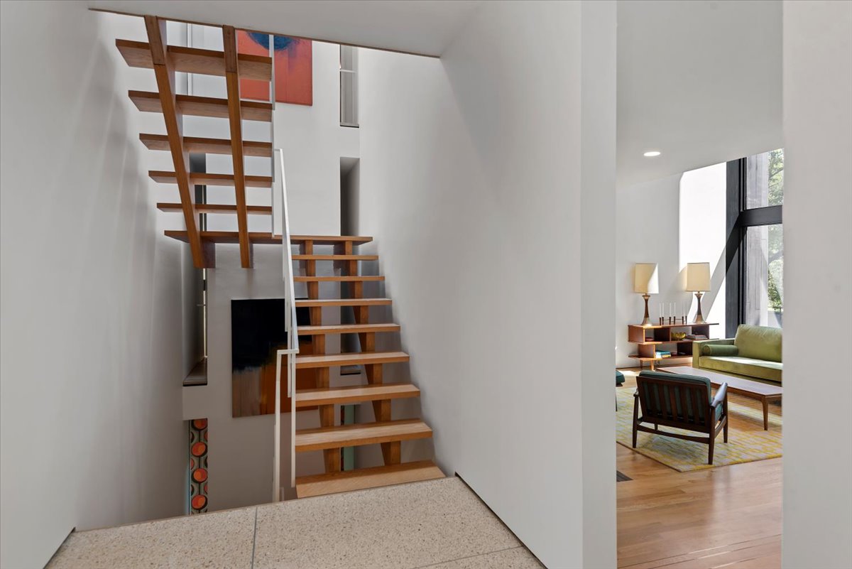 Notable elements: 3 fireplaces, a front floating deck, back Patio and rooftop deck, a mix of terrazzo and white Oak hardwood floors and floor-to-ceiling windows.
