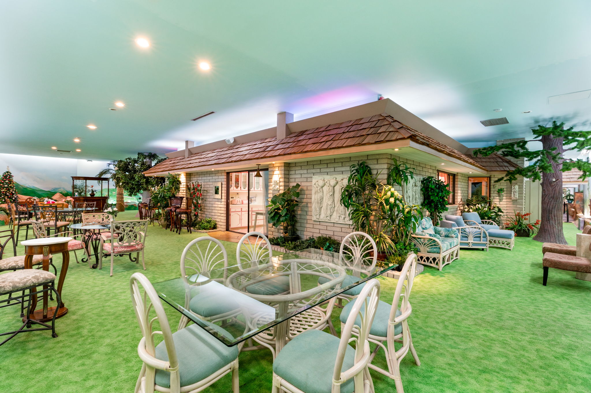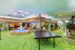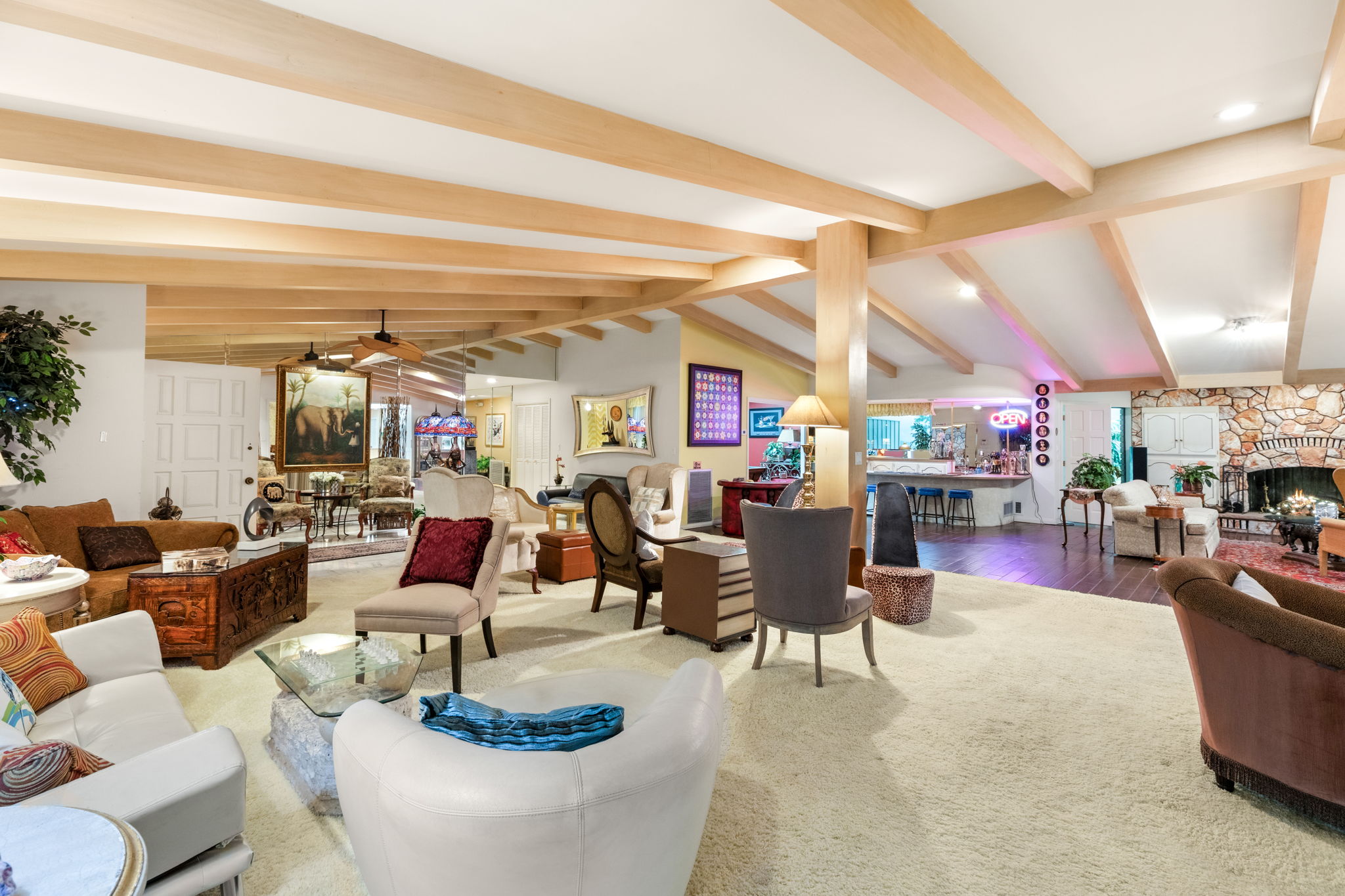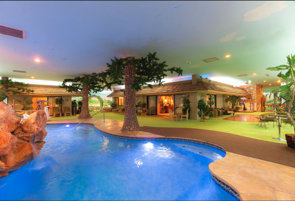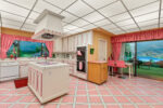 The residence is as functional as it is imaginative. A retro 1970s kitchen, pristine in its original detail, offers a nostalgic yet practical culinary hub. Leisure amenities abound: an indoor swimming pool, putting green, theater, dance floor, bar, sauna, and hot tubs create endless possibilities for entertaining and relaxation. Every space was designed for self-contained living, blending both extravagance and purpose.