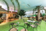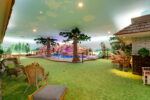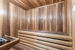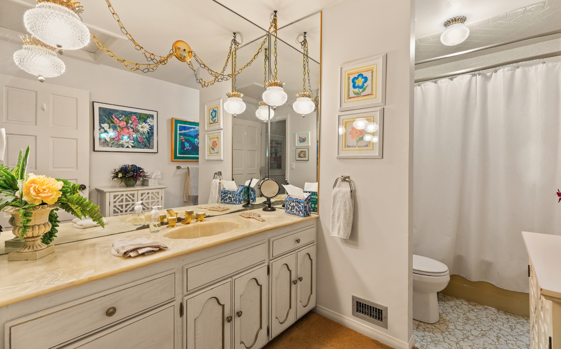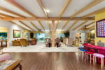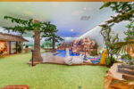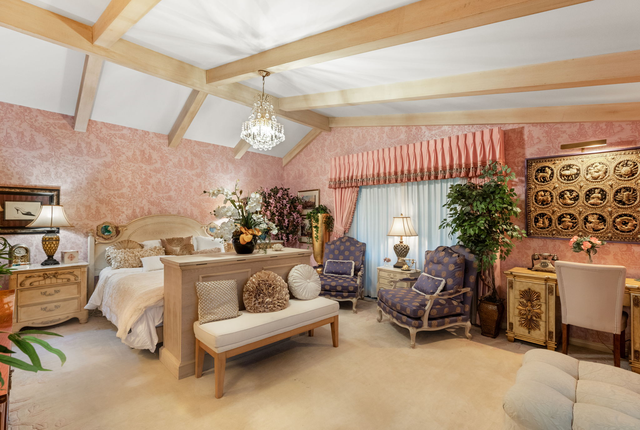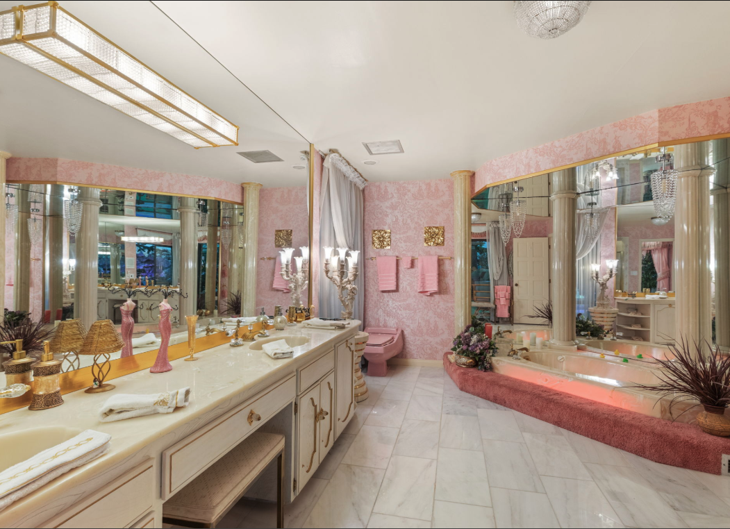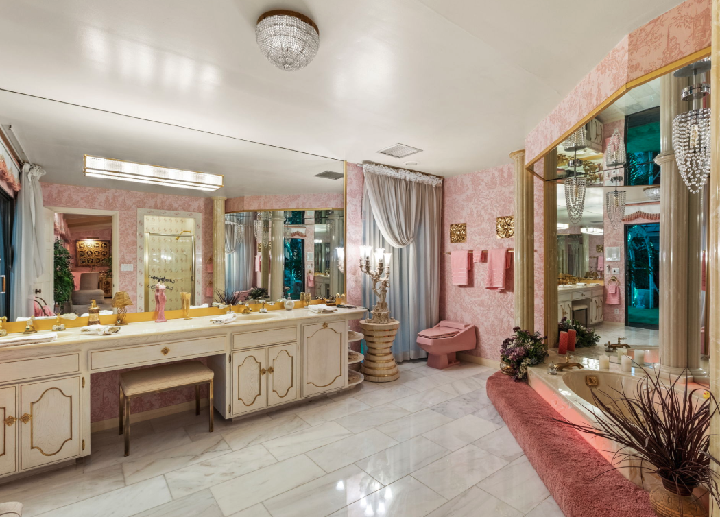 The residence is as functional as it is imaginative. A retro 1970s kitchen, pristine in its original detail, offers a nostalgic yet practical culinary hub. Leisure amenities abound: an indoor swimming pool, putting green, theater, dance floor, bar, sauna, and hot tubs create endless possibilities for entertaining and relaxation. Every space was designed for self-contained living, blending both extravagance and purpose.