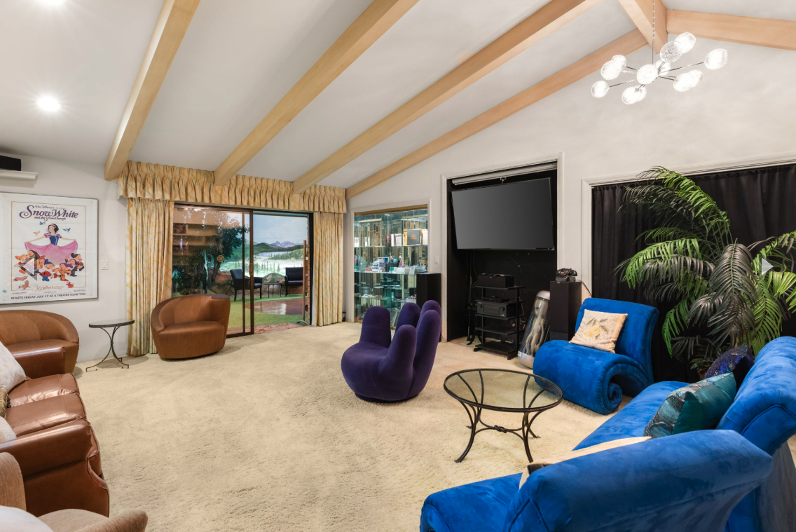 Step into a ship-in-a-bottle world, where every detail has been carefully designed to evoke a sense of wonder. Above ground, the property sits on over one acre with a 4-car garage, but its true magic lies below. Here, 5 bedrooms and 6 bathrooms are surrounded by immersive living spaces designed to mimic the outdoors. A programmable faux sky shifts from sunrise to starry night, giving each day a natural rhythm. Surrounding walls are adorned with hand-painted murals depicting landscapes from Henderson’s favorite places—New Zealand, Switzerland, the Hollywood Hills, and more.