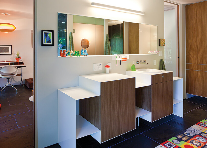 What better way to rev-up your restroom, than with a new cabinet layout? During this renovation, the Steinbergs focused on the contrast between light and dark that is subsequently echoed through the rest of their home. So when enclosing a walnut veneer with a ceramic white outer structure, they allow for a unique blend of colors to add depth to this space and match their overall aesthetic. Learn more about this renovation here.