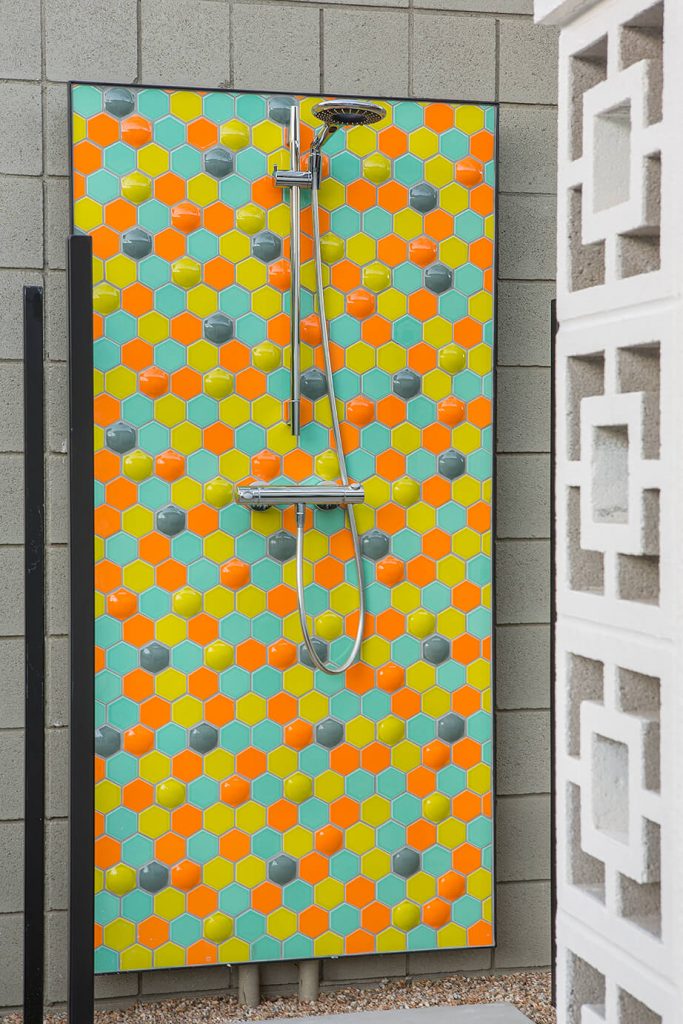 In their mid century guest home, Randy Shemaitis and Keith Zabel took a technicolor tile scheme to heart. By incorporating orange, green, blue, and grey hexagonal tiles into the shower, they wanted to capture the unique MCM vibe that only Palm Springs can provide. “We want [people] to think ‘Palm Springs'” when they enter, says Keith. And that is what guests will get with this groovy guise! Learn more about the Stardust Oasis guest home here.