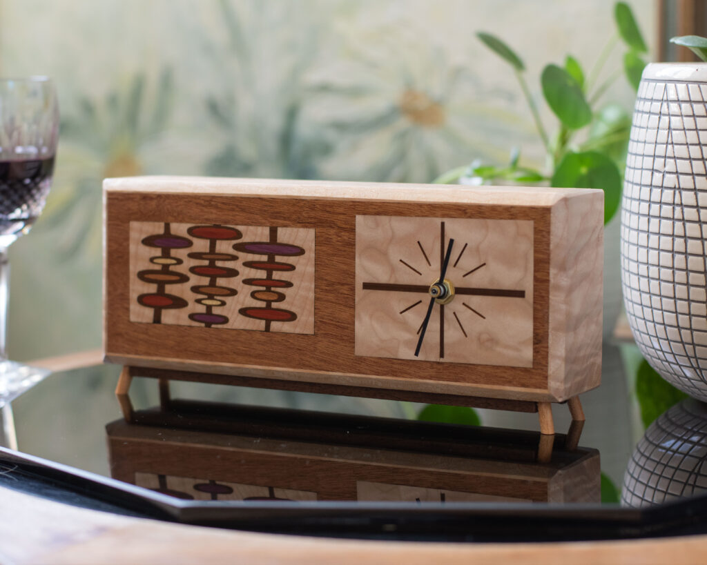 This Atomic Era retro inspired clock sits handsomely on any office desk, end table or nightstand. Resembling a classic MCM credenza and fun googie art made entirely from natural wood without stains or dyes. Thank you to Jenn Ski for the artwork inspiration!