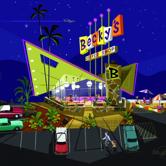 Mac George’s works feature a variety of subject matter, but most are inspired by the Mid Century Modern design aesthetic he fondly remember as a child. The compositions highlight Mid Century Modern treasures, and thankfully some of these architectural survivors are left to enjoy and inspire. All prints are limited editions and are made with museum quality inks and paper. These prints are the perfect gift for everyone who has an appreciation for Mid Century Modern.